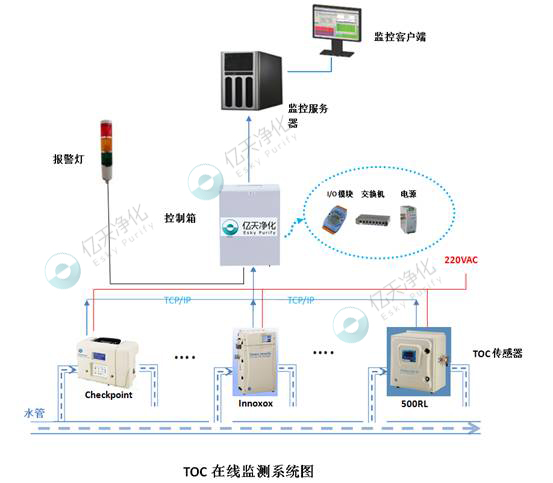 系統(tǒng)主要是由TOC傳感器、電控箱、服務(wù)器及監(jiān)測(cè)軟件組成。通過(guò)CheckPoint TOC傳感器采集數(shù)據(jù),電控系統(tǒng)傳輸數(shù)據(jù),監(jiān)控服務(wù)器負(fù)責(zé)保存處理數(shù)據(jù),達(dá)到數(shù)據(jù)實(shí)時(shí)在線監(jiān)測(cè)目的,還可以提供各種輔助功能,如:TOC歷史數(shù)據(jù)查詢、圖表生成、操作記錄、報(bào)警預(yù)警等,幫助用戶及時(shí)發(fā)現(xiàn)問(wèn)題、分析問(wèn)題、解決問(wèn)題。