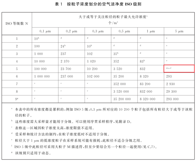 表中所有濃度都是累積濃度,例如ISO5.5 級(jí),0.5μm 粒徑的11100 顆中,包括所有粒徑大于或等于該粒徑的粒子。