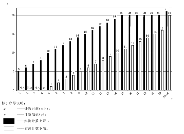 在圖 D.2 中畫出了實(shí)測(cè)計(jì)數(shù)的上下限與計(jì)數(shù)獲取時(shí)間之間的關(guān)系。其所在列表示的是在1 min 的時(shí)間間隔內(nèi)的限值(上限和下限)。